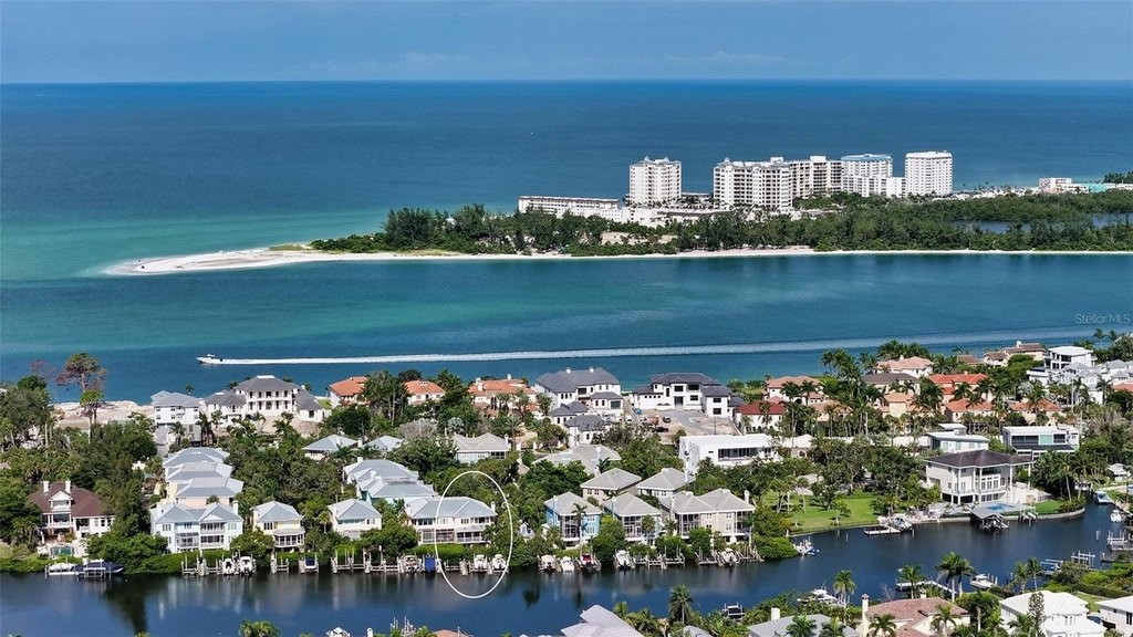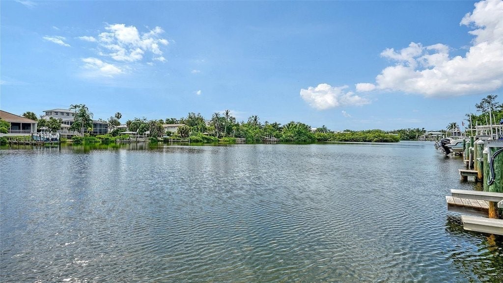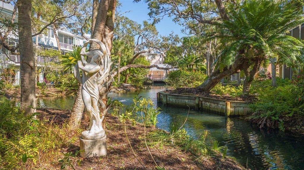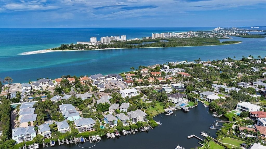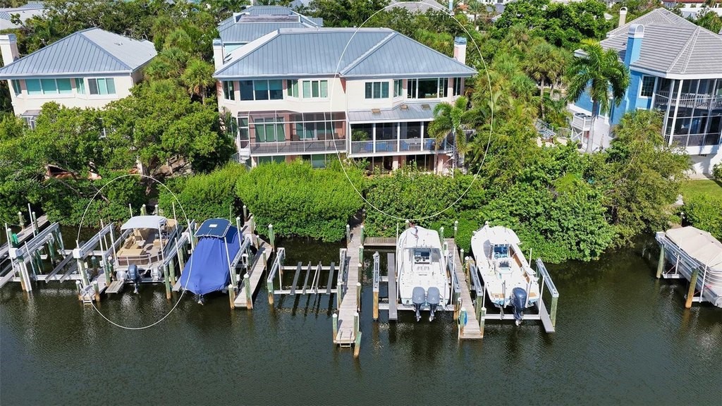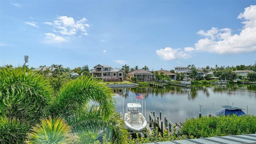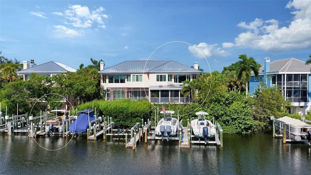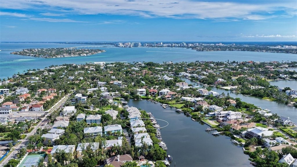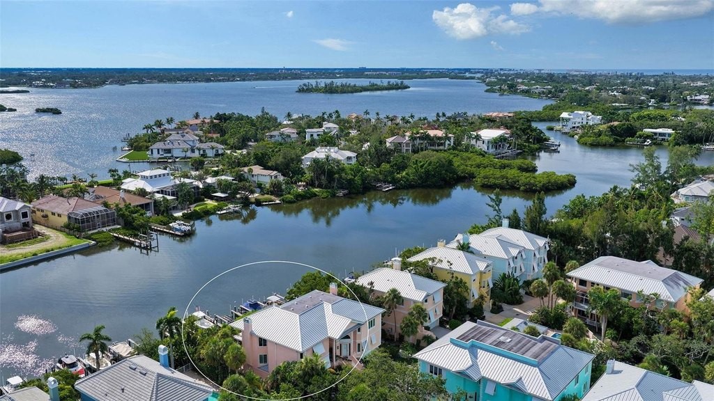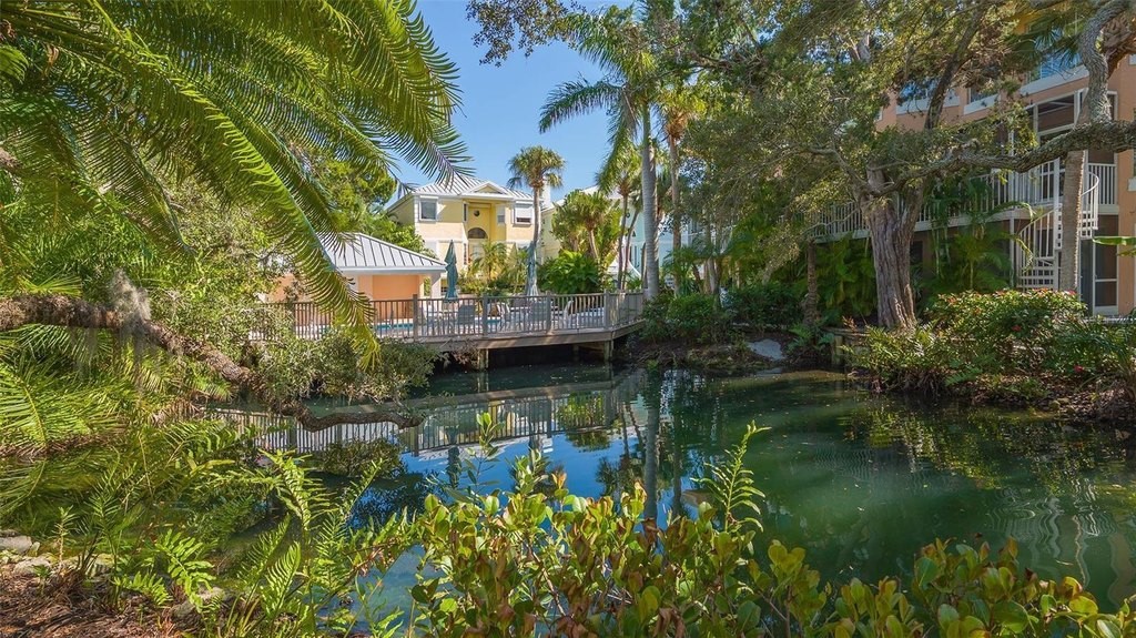 Exquisite waterfront townhome in private gated community with architectural detail in the Bermuda tradition. Lush tropical landscaping , dramatic pool area with view of lagoon and fountain and overhanging Oaks. Tennis and Pickleball Court. Deeded deep water protected dock with lift, electric and water at dock provided by the Association. No bridges to the intercoastal. This home has enchanting wide water views of the Bayou from almost every room. Mangroves make this body of water a beautiful environment for fish and other wildlife. A covered balcony overlooking the water is the perfect spot to sit and sip your cocktail. This home has been beautifully renovated with fine finishes and many artistic touches. Open gourmet kitchen witih large center island. Pantry, storage and corner sitting area with window seat. Impact glass windows throughout. Inviting great room with gas fireplace and charming ambiance. Three bedrooms with ensuite baths and large family room. Elevator from garage to second and third floor. Small enclosed yard on ground floor. Walk right out to your boat and enjoy all that Siesta Key has to offer. Located on the North end of Siesta, minutes to Shell Beach, Siesta Village and the famous white sand of Crescent Beach. Minutes by car to downtown Sarasota with endless cultural opportunities and fabulous shopping and restaurants.