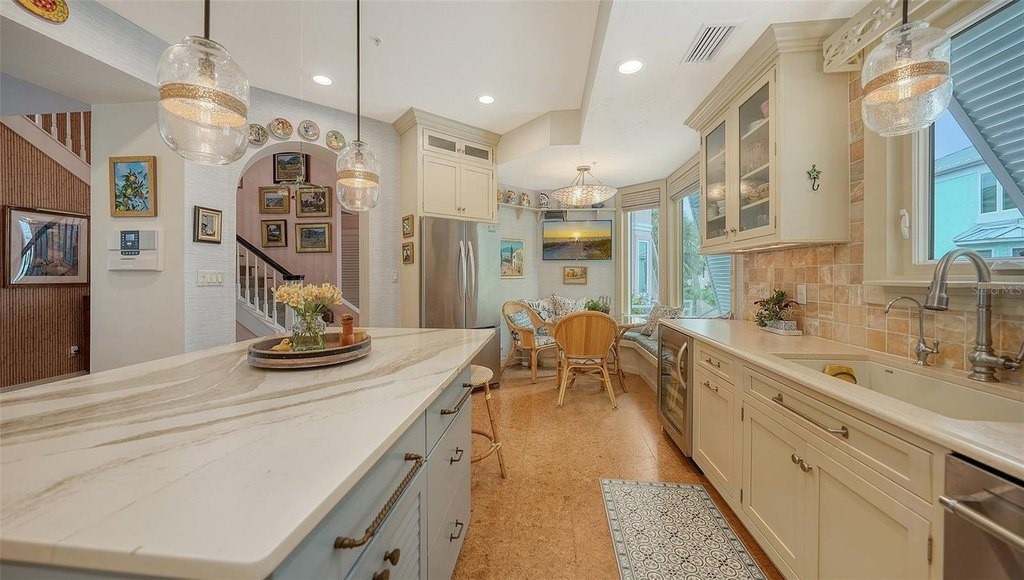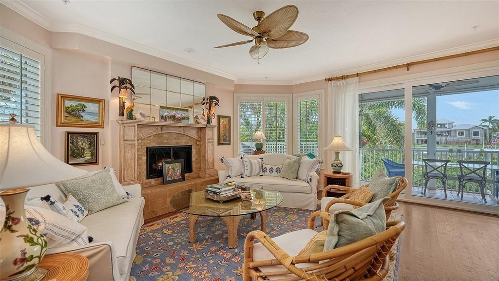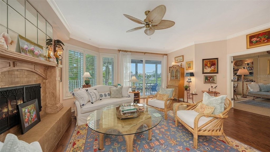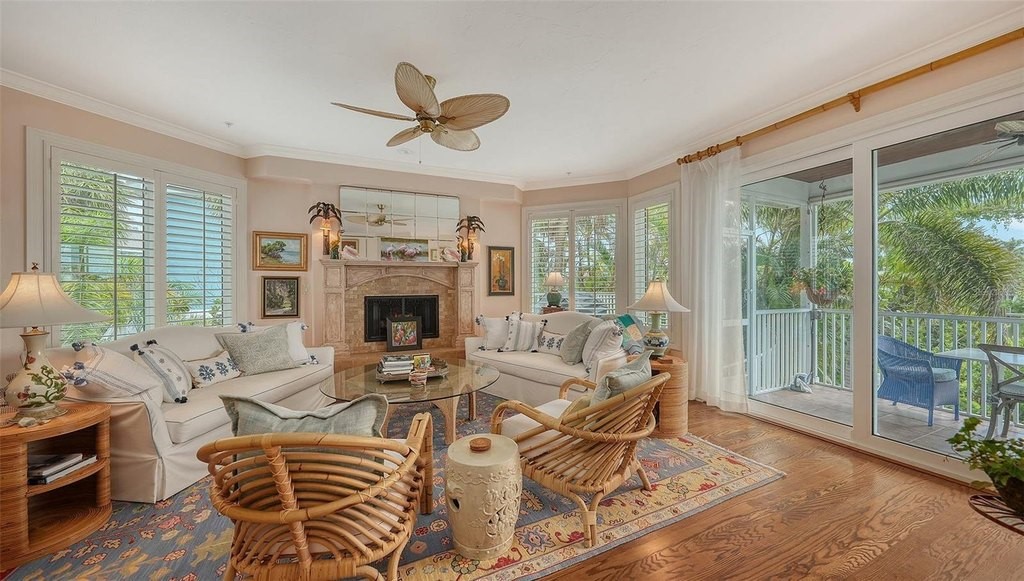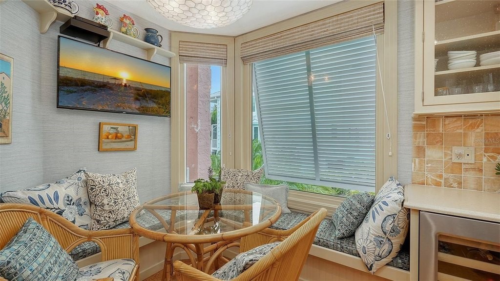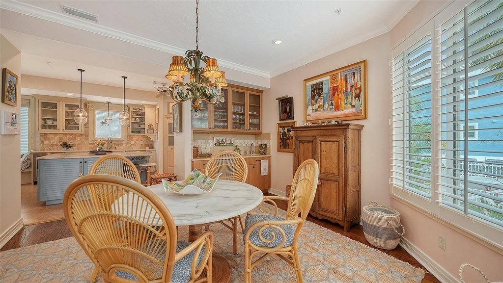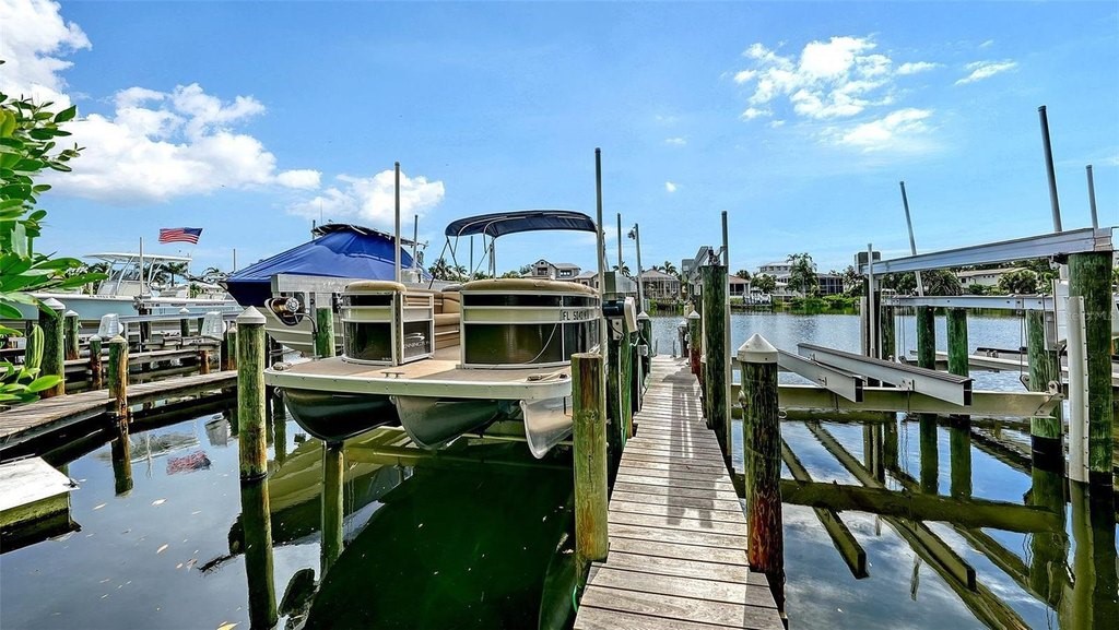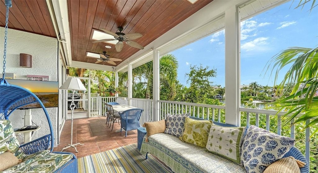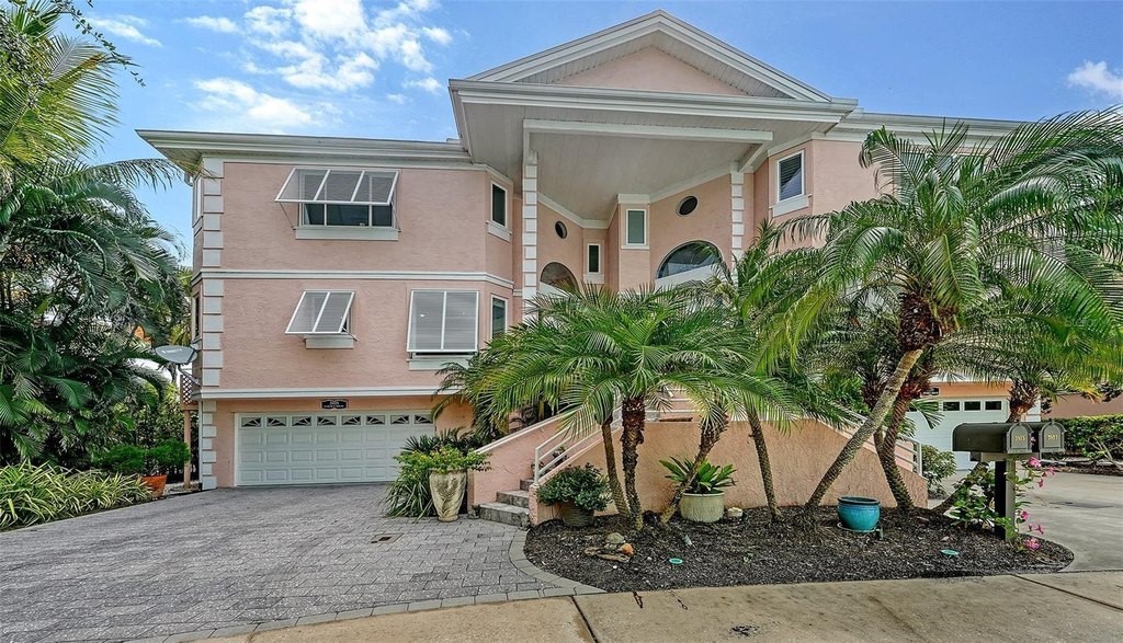 Exquisite waterfront townhome in private gated community with architectural detail in the Bermuda tradition. Lush tropical landscaping , dramatic pool area with view of lagoon and fountain and overhanging Oaks. Tennis and Pickleball Court. Deeded deep water protected dock with lift, electric and water at dock provided by the Association. No bridges to the intercoastal. This home has enchanting wide water views of the Bayou from almost every room. Mangroves make this body of water a beautiful environment for fish and other wildlife. A covered balcony overlooking the water is the perfect spot to sit and sip your cocktail. This home has been beautifully renovated with fine finishes and many artistic touches. Open gourmet kitchen witih large center island. Pantry, storage and corner sitting area with window seat. Impact glass windows throughout. Inviting great room with gas fireplace and charming ambiance. Three bedrooms with ensuite baths and large family room. Elevator from garage to second and third floor. Small enclosed yard on ground floor. Walk right out to your boat and enjoy all that Siesta Key has to offer. Located on the North end of Siesta, minutes to Shell Beach, Siesta Village and the famous white sand of Crescent Beach. Minutes by car to downtown Sarasota with endless cultural opportunities and fabulous shopping and restaurants.