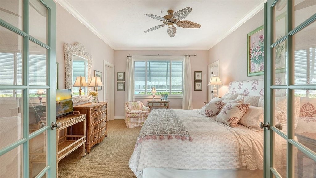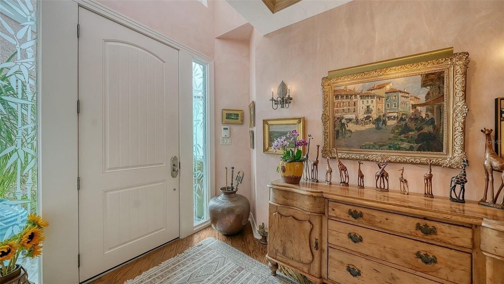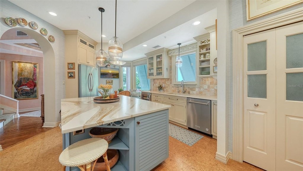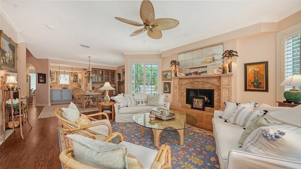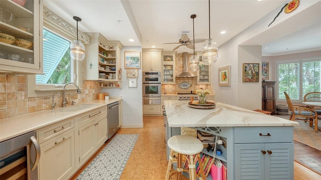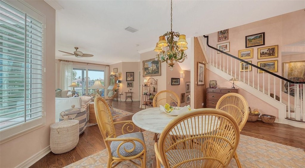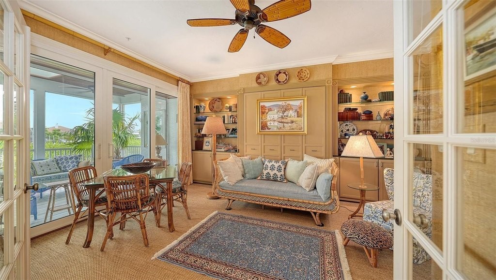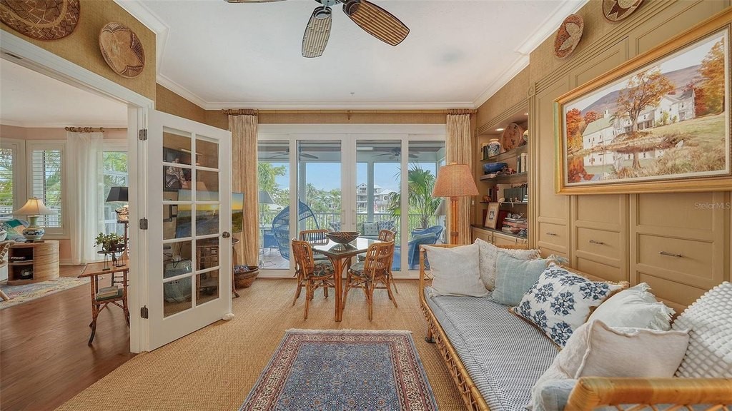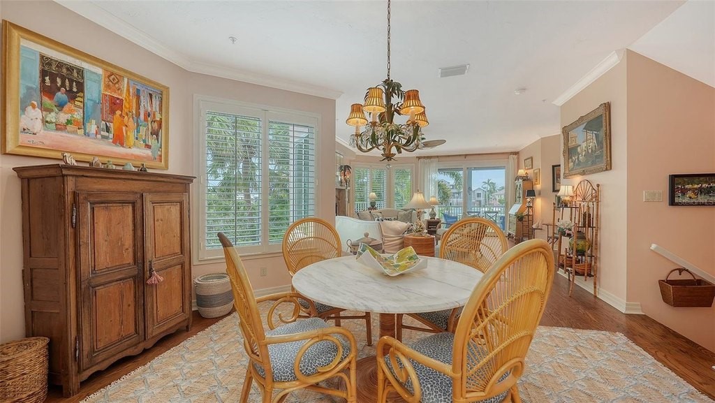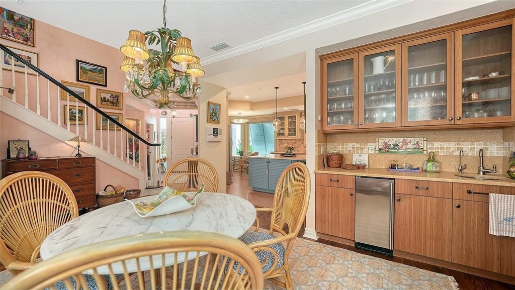 Exquisite waterfront townhome in private gated community with architectural detail in the Bermuda tradition. Lush tropical landscaping , dramatic pool area with view of lagoon and fountain and overhanging Oaks. Tennis and Pickleball Court. Deeded deep water protected dock with lift, electric and water at dock provided by the Association. No bridges to the intercoastal. This home has enchanting wide water views of the Bayou from almost every room. Mangroves make this body of water a beautiful environment for fish and other wildlife. A covered balcony overlooking the water is the perfect spot to sit and sip your cocktail. This home has been beautifully renovated with fine finishes and many artistic touches. Open gourmet kitchen witih large center island. Pantry, storage and corner sitting area with window seat. Impact glass windows throughout. Inviting great room with gas fireplace and charming ambiance. Three bedrooms with ensuite baths and large family room. Elevator from garage to second and third floor. Small enclosed yard on ground floor. Walk right out to your boat and enjoy all that Siesta Key has to offer. Located on the North end of Siesta, minutes to Shell Beach, Siesta Village and the famous white sand of Crescent Beach. Minutes by car to downtown Sarasota with endless cultural opportunities and fabulous shopping and restaurants.